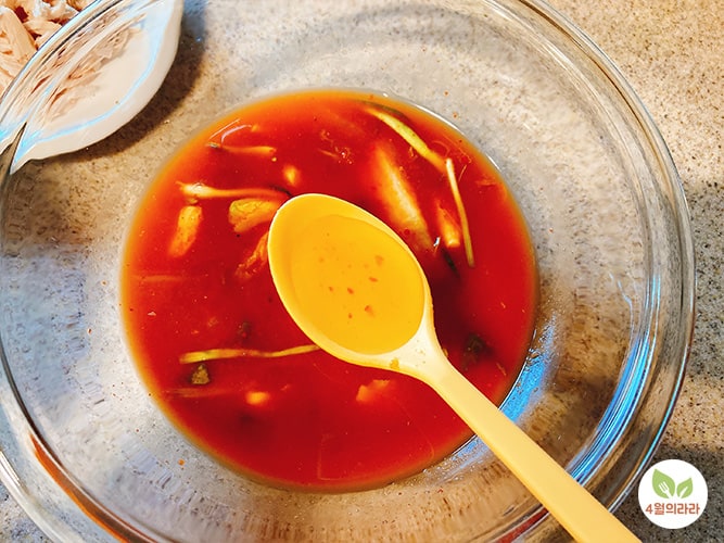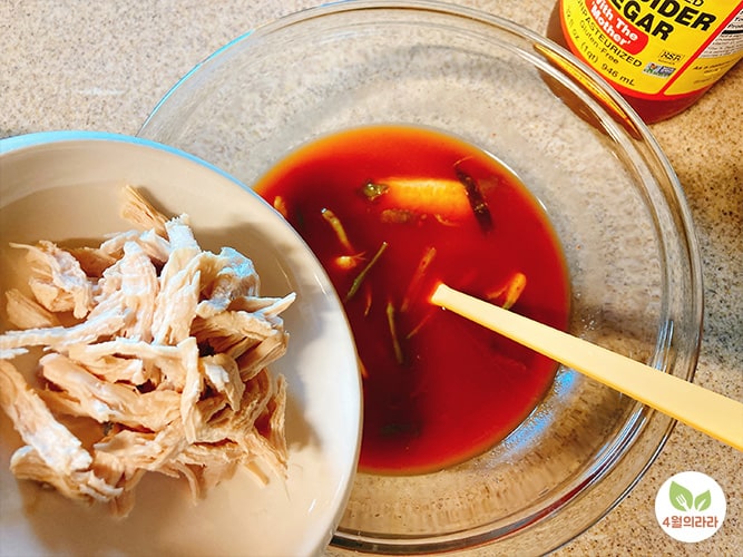 삶은 닭가슴살을 찬물에 헹궈 결대로 쪽쪽 찢어 김칫국물에 넣어주세요. 닭가슴살에 맛있는 김칫국물의 맛이 베어 들어올 거예요.