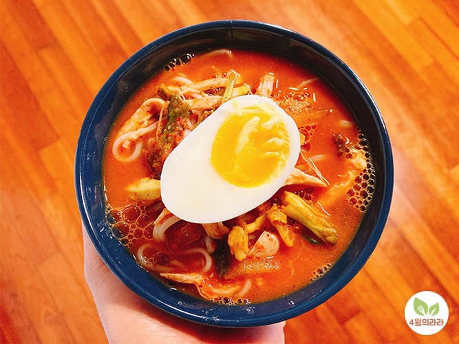 전 이렇게 반숙 올린 김치말이국수를 먹었어요. 봄동김치의 맛이 그대로 느껴지면서 새콤달콤하니 어찌나 맛나던지요.