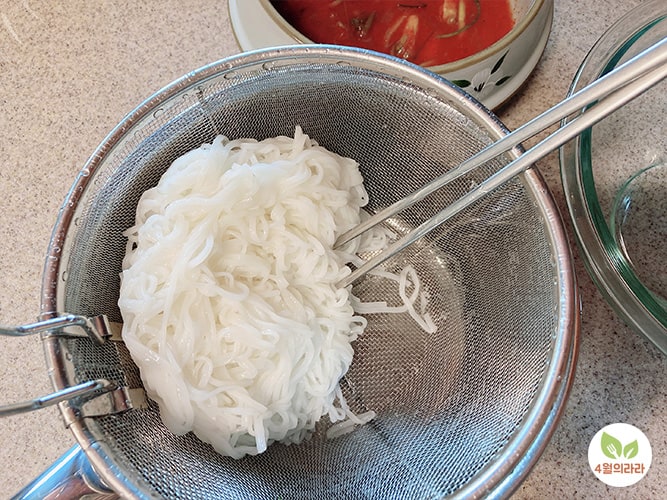 찬물에 헹궈내고 체에 받혀 물기를 빼주세요.