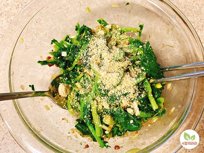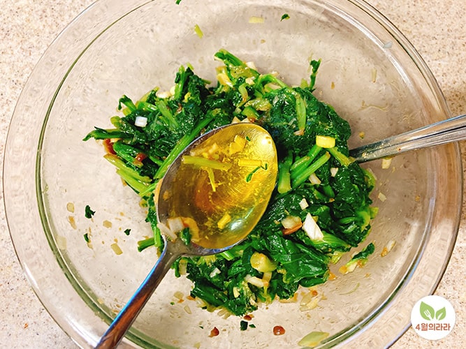 나물 다 무쳤다면 마지막으로 생들기름 한 숟가락 넣어 조물조물~ 참기름 향 좋아하신다면 살짝 더 추가~