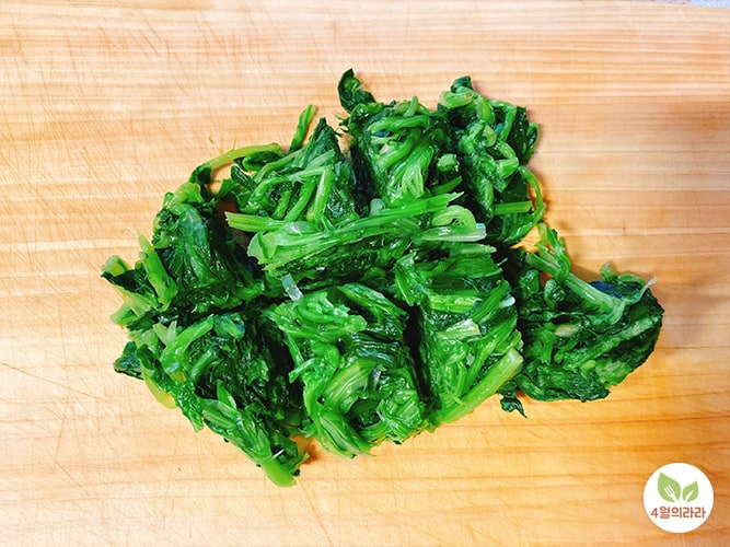 평소 위가 약한 옆지기 때문에 나물은 늘 줄기 이파리 따로 다듬어 시간차를 두고 데쳐냈어요. 유채는 워낙 부드럽다 보니 그냥 한꺼번에 끓는 물에 넣어 데친 후 위 사진처럼 적당히 크기로 잘라주었습니다. 세상 편하네요. ^^;;