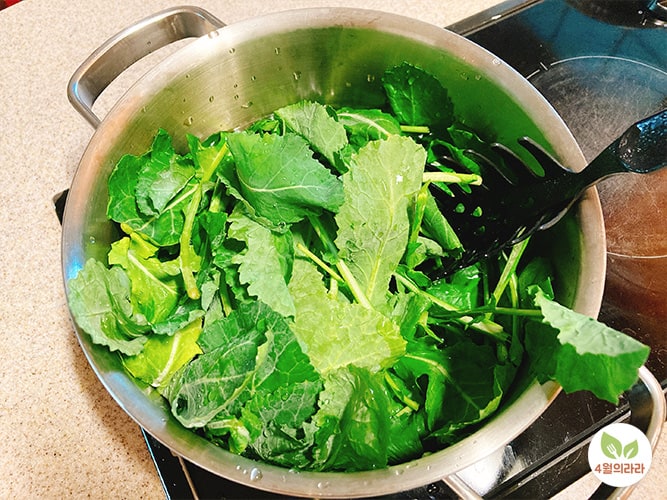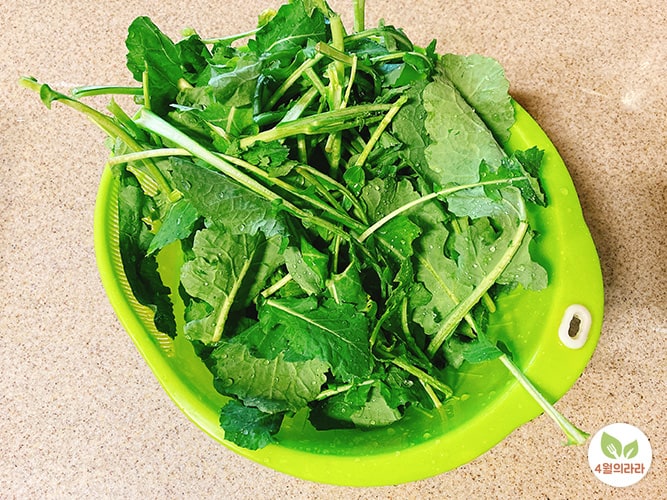 보기에는 억세보이고, 줄기도 굵고 좀 그래 보이지만, 데쳐내면 부드러워요. 이대로 물에 가서 씻어줍니다. 전 3번 정도 씻은 것 같아요. 유채는 예로부터 여성에게 산모의 회복력을 돕고 종기를 가라앉히는 효능이 있다고 알려졌어요. 여자에게 좋으니 우리 엄마들 많이 챙겨보아요. ^^