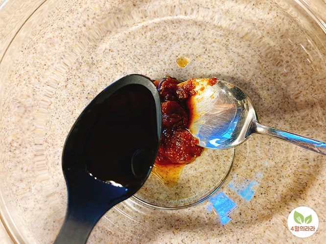 이제 양념 만들어 볼게요. 전 된장에, 개복숭아청이랑 까나리액젓 조금 넣었어요.