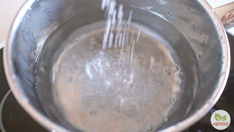 끓는 물에 소금을 넣고 부지깽이나물을 데쳐줍니다. 넣자마자 바로 뺄거예요.