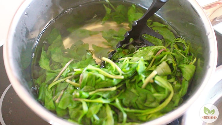 소금 넣고 불을 끄고 나물을 끓는 물에 넣자마자 바로 건져 찬물에 헹궈 물기를 꽉 짜주었습니다.