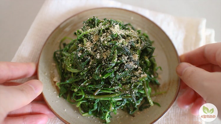 그릇에 담고 들깻가루를 솔솔 뿌려주었습니다. 부지깽이나물무침 완성~