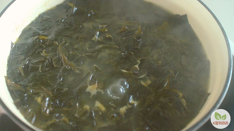2. 냄비에 미역, 국간장, 참기름으로 볶다가 육수를 조금씩 부어가며 끓인다.