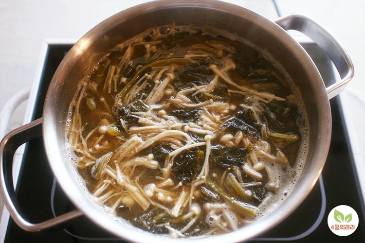 손질한 아욱을 모두 넣어 끓여줍니다. 끓기 시작하면 약불로 낮추고 오래 뭉긋하게 끓여주세요. 전 가장 약한 단계로 두고 1시간 정도 푹 끓여주었습니다.