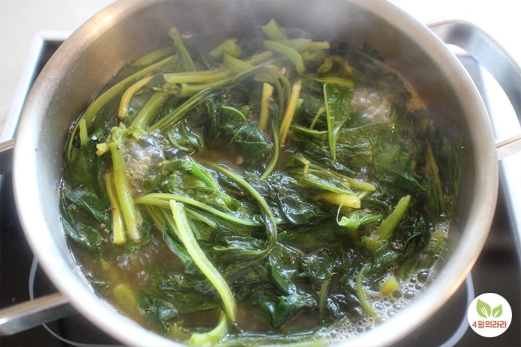 1시간이 지나고 다시 불을 올려주었어요. 푹 익어 아욱의 색이 달라지고 확실히 부드러워짐이 느껴집니다.