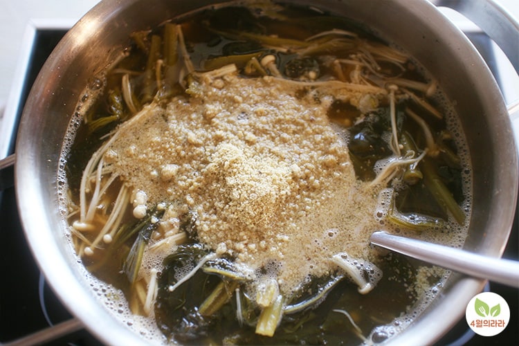 팽이버섯과 들깨가루를 넣어 간을 보세요. 전 까나리액젓 이용했습니다.
