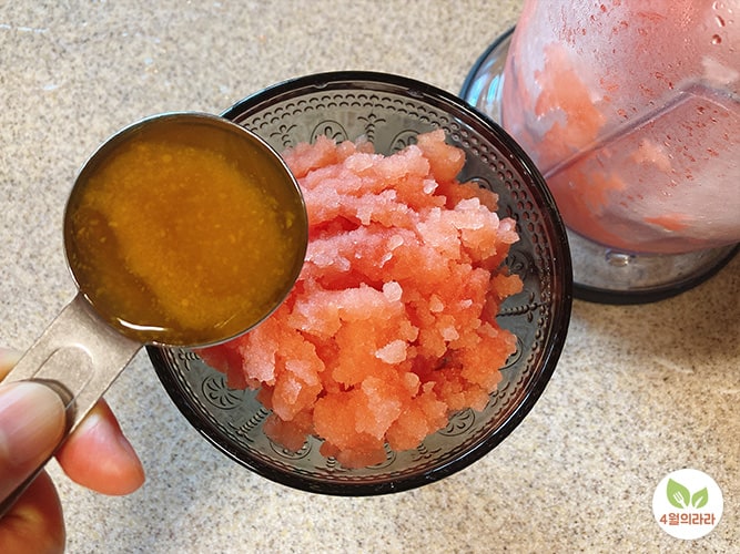 덩어리가 남게 설렁설렁 갈아준 후 생강청을 넣어줍니다. 수박이 생강이 맛이 참 잘 어울려요. 또한 수박이 성질이 차니 뜨거운 생강과 잘 어울립니다.