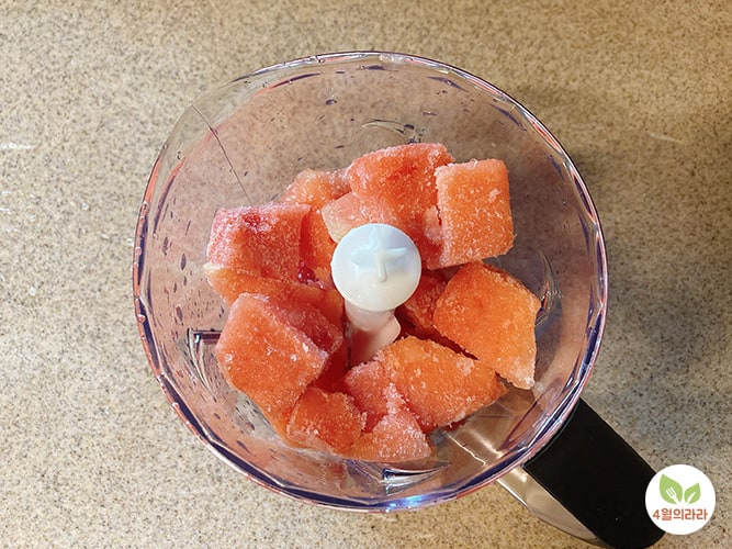 냉동실에 수박을 꺼내 얼음을 부술 수 있는 믹서기 이용해서 갈아줍니다. 드륵드륵 수박만 갈아주세요.
