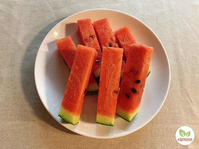자잘하게 원으로 잘라먹기도 좋아요. 수박이 정말 달고 맛있어서 손질하는 내내 집어 먹었더니 배가 불러요.