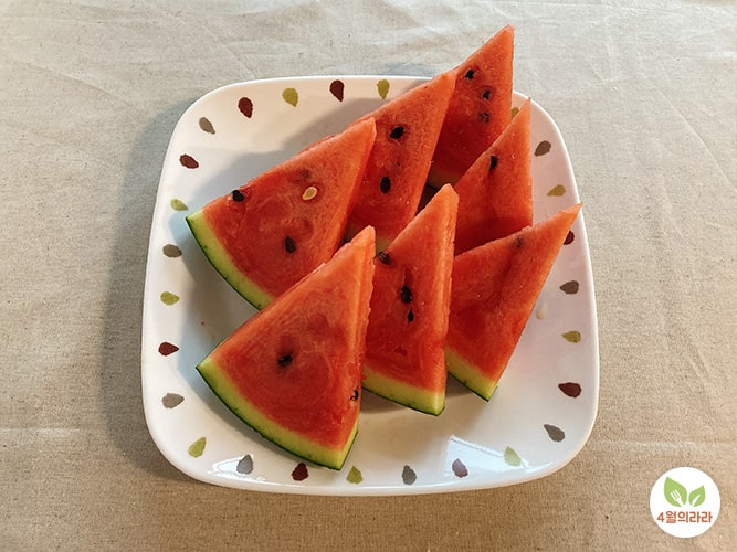 반으로 쪼갰는데, 칼이 들어가자마자 쩍~ 잘 익은 수박은 먼저 잘리잖아요. 이 수박이 그렇더라고요. 완전 잘 익었어요.