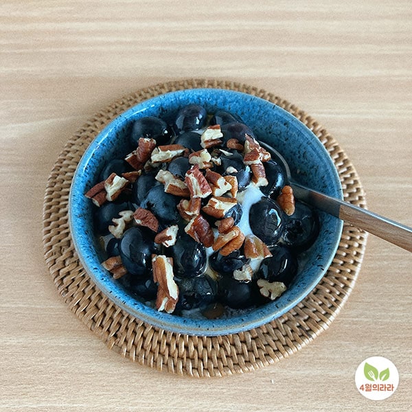 그릭요거트에 생블루베리를 가득 넣고, 피칸을 잘라 뿌려주고, 꿀도 뿌려주었어요. 이렇게 먹으니 정말 맛있더라고요.