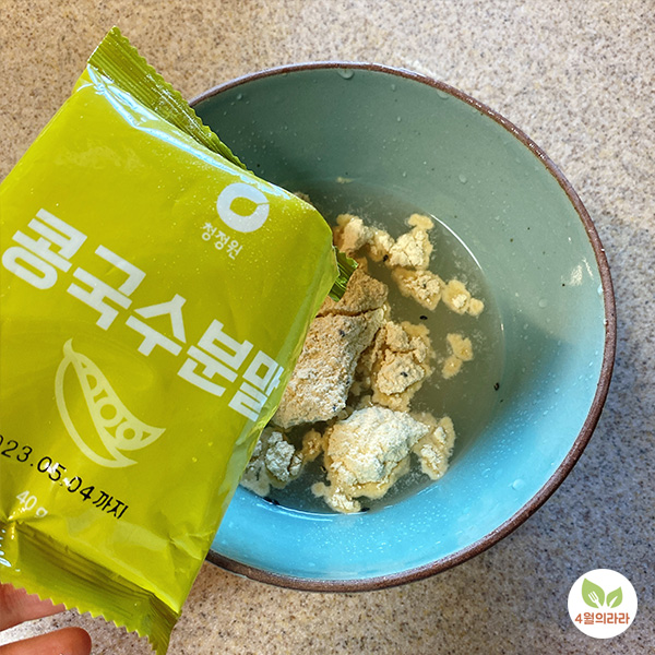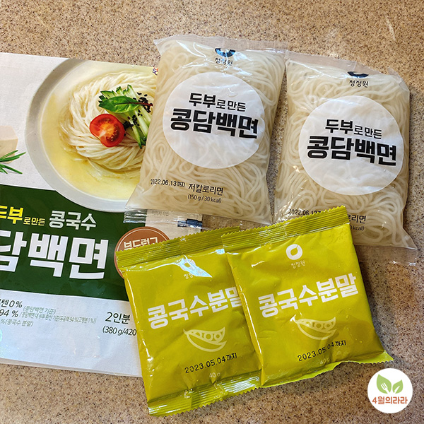 마지막으로 제가 좋아하는 콩국수, 역시 두부로 만든 면과 콩국수 분말수프가 들어 있습니다. 면은 앞에서처럼 체에 밭쳐 물기를 빼주는 정도로 준비해주세요.