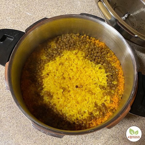 전 냉동실에 보관 중인 삶은 렌즈콩이 있어서 추가해 봅니다. 이제 압력밥솥에 뚜껑을 닫고 평소대로 밥을 지어주면 강황밥이 완성됩니다.