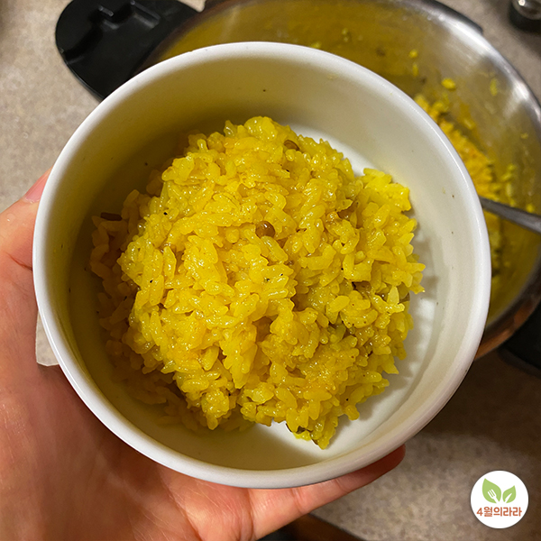 완성된 강황밥입니다. 색이 노랗죠. 바닥까지 골고루 섞어주세요. 강황밥 만들기 어렵지 않으시죠.