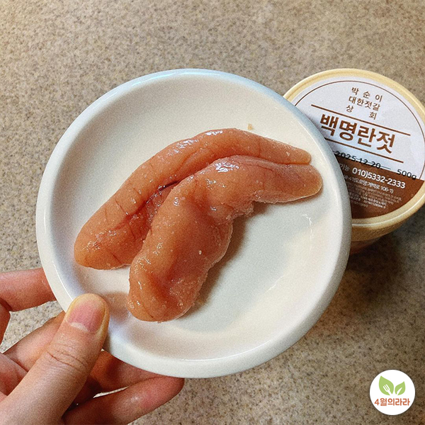명란젓인데, 양념이 되어 있지 않은 저염 백명란입니다. 깔끔하게 통에 담겨 판매하니 꺼내 쓰기도 좋고 편하더라고요.